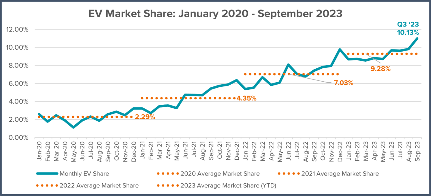 - EVs represent 10.1 percent of new light-duty vehicle sales in Q3 2023, up from 9.1 percent in Q2 2023 and 7.1 percent in Q3 2022;