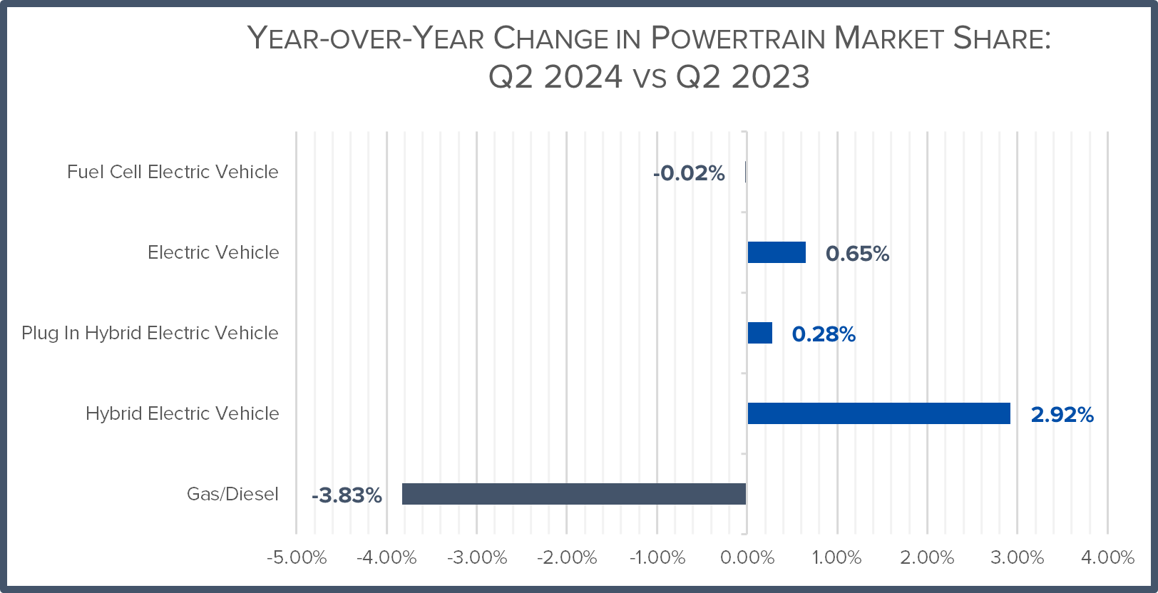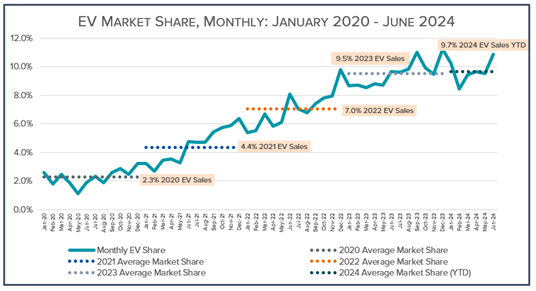 - EVs represent 9.96 percent of new light-duty vehicle sales in Q2 2024, up from 9.34 percent in Q1 2024 and 9.05 percent in Q2 2023;