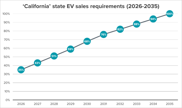 - California, Oregon, Washington State, New York, Massachusetts and Vermont have adopted ACC II starting in model year 2026.