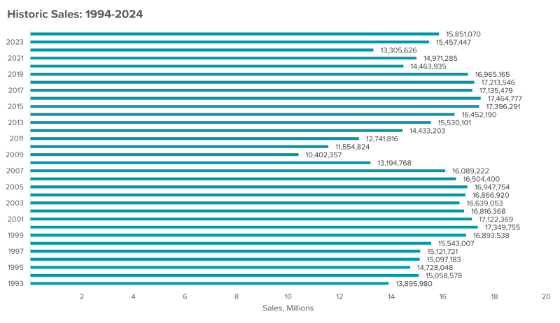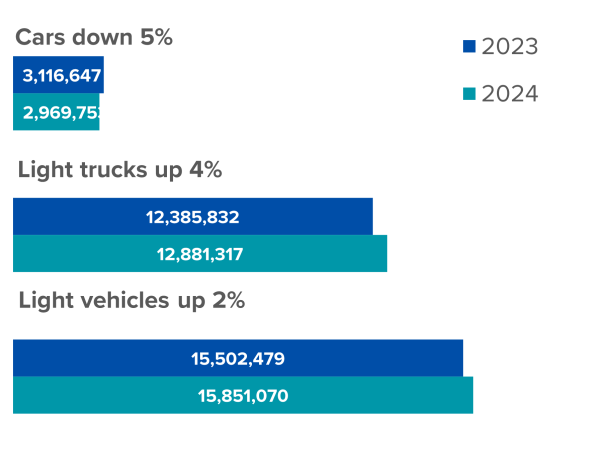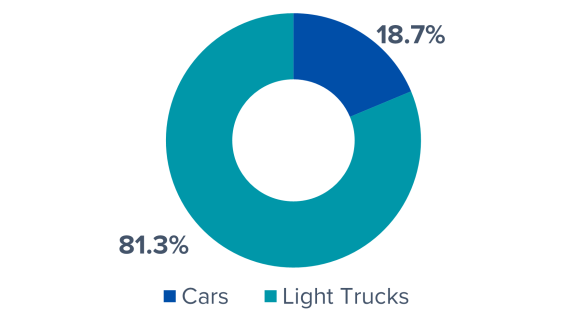 Light trucks (SUVs, CUVs, vans, pickups) continue to be popular. In 2024 light truck market share increased by 1.4 percentage points to 81.3 percent – breaking last year's record to be the highest in history. The upward trend in the popularity of light trucks over cars has been steady since 2013, when only 1.2 percent of market share separated the two segments; by the end of 2024, the divide has grown to nearly 66 percent.